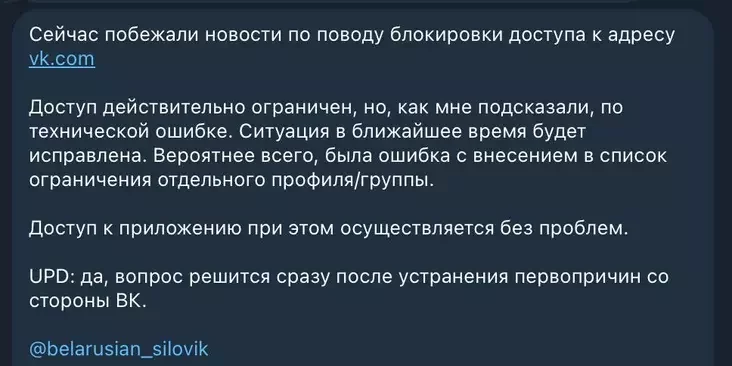 «Dostup sapraŭdy abmiežavany, ale, jak mnie padkazali, praz techničnuju pamyłku. Situacyja nieŭzabavie budzie vypraŭlenaja. Chutčej za ŭsio, była pamyłka z uniasieńniem u śpis abmiežavańnia asobnaha profilu/hrupy», — skazana ŭ kanale.