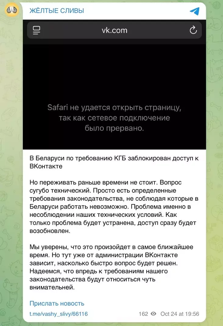 Paźniej «Biełaruski siłavik» dapoŭniŭ: desktop-viersija sacsietki nie pracuje, bo kampanija nie vykanała patrabavańni dziaržaŭnych orhanaŭ. «VK nie zachacieŭ uličvać intaresy Biełarusi i zalacieŭ u błok».