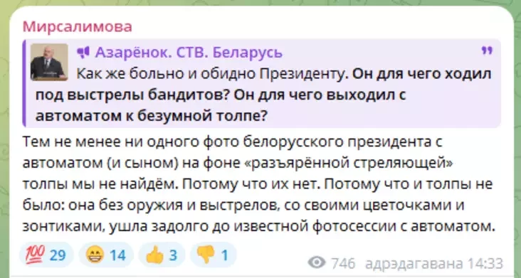 «Tym nie mienš nivodnaha fota biełaruskaha prezidenta z aŭtamatam (i synam) na fonie «raźjušanaha natoŭpu, jaki stralaje», my nie znojdziem. Bo ich niama. Bo i natoŭpu nie było: jon, biez zbroi i strełaŭ, sa svaimi kvietačkami i parasonami, syšoŭ zadoŭha da viadomaj fotasiesii z aŭtamatam».