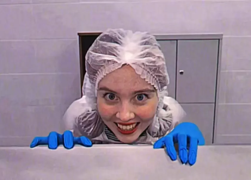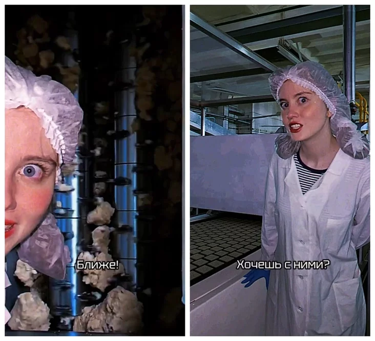 Hierainiu rolika — dziaŭčynu ŭ biełym chałacie — my sustrakajem u pustym cechu. Jana ŭśmichajecca zanadta šyroka, havoryć rypučym hołasam, a jaje ruchi — rvanyja, niby pakadravyja, što stvaraje tryvožny i nierealistyčny vobraz.
