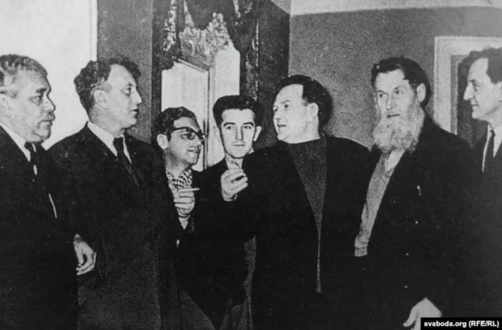 Źleva naprava: Pavieł Kabzareŭski, Ryhor Biarozkin, Navum Kiślik, Ryhor Baradulin, Anatol Vialuhin, Uładzimir Duboŭka, Juryj Bahuševič padčas IV źjezda biełaruskich piśmieńnikaŭ, 1959 hod.