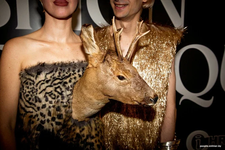 Dyzajnierka Alena Acapkina pryjšła ŭ čornaj sukiency, drapiravanaj futram, z hałavoj kazuli z pazałočanymi rahami.
