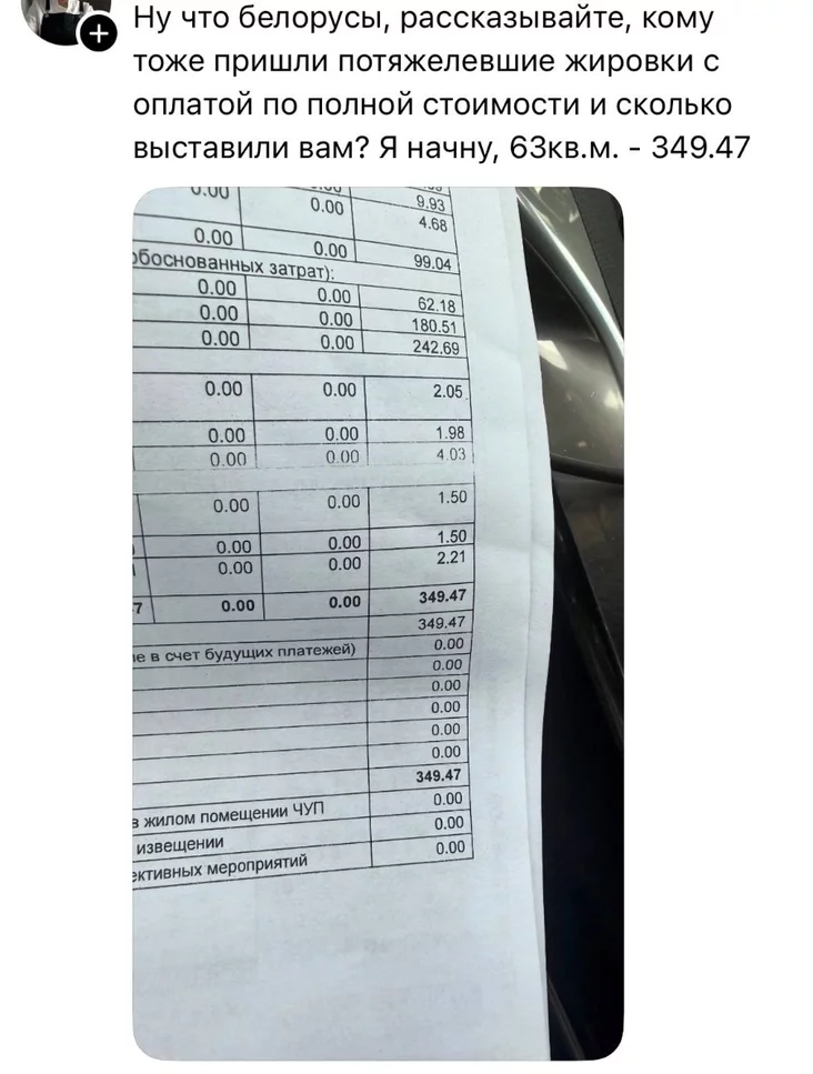 «Nu što biełarusy, raskazvajcie, kamu taksama pryjšli paciažełyja žyroŭki z apłataj pa poŭnym košcie i kolki vystavili vam? Ja pačnu, 63 kv. m — 349,47».
