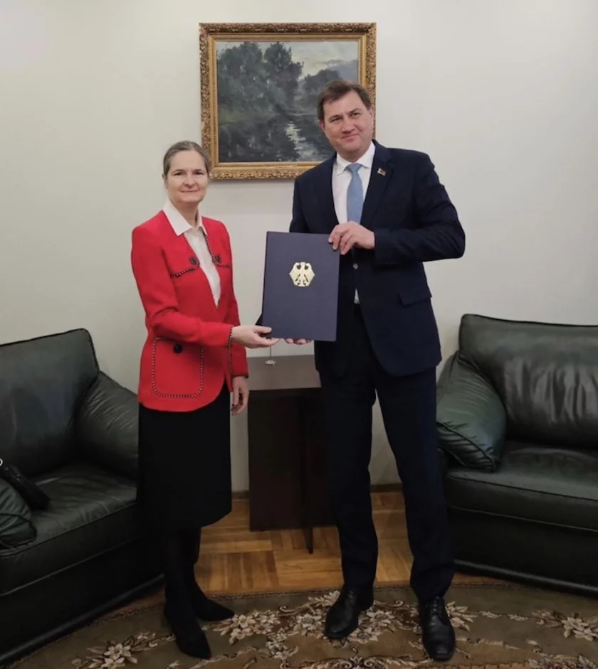 Pavieranaja ŭ spravach Hiermanii ŭ Biełarusi ŭručyła davierčuju hramatu kiraŭniku MZS Biełarusi. Pra heta paviedamlaje pasolstva FRH u Minsku ŭ svaich sacsietkach.