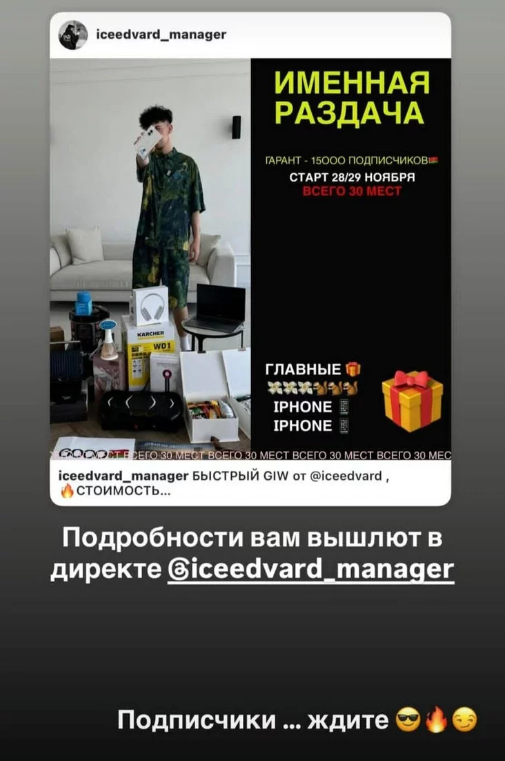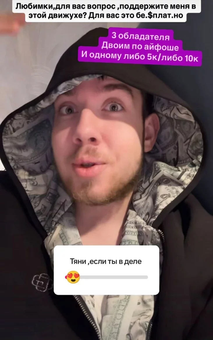 Siarod svaich padpisčykaŭ, chto adreahuje na rekłamnuju storys, błohier abiacaje razyhrać dva ajfony i ci to 5 tysiač, ci to 10 tysiač rubloŭ. Kaža, prosta adčuvaje patrebu paradavać svaju aŭdytoryju.