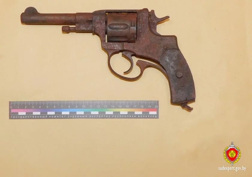 Sudovyja ekśpierty ŭstanavili, što heta revalvier sistemy «Nahan» uzoru 1895 hoda. Zbroja akazałasia nie prydatnaj dla stralby.