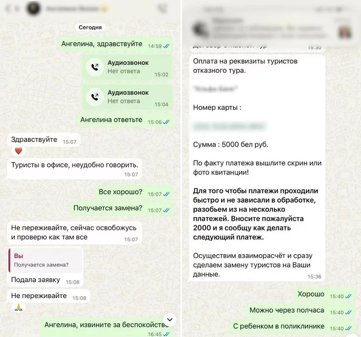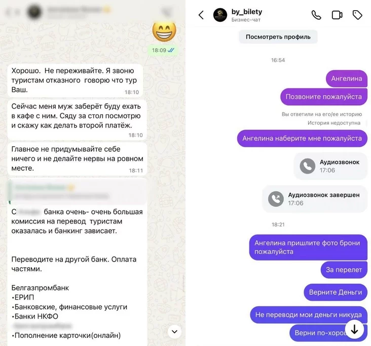 Kamunikacyja z «turahientam Anhielinaj» vialisia vyklučna praź pierapisku ŭ WhatsApp: miarkujučy pa skrynšotach, machlary zvanki skidvali, vydumlajučy roznyja apraŭdańni, čamu niazručna razmaŭlać.