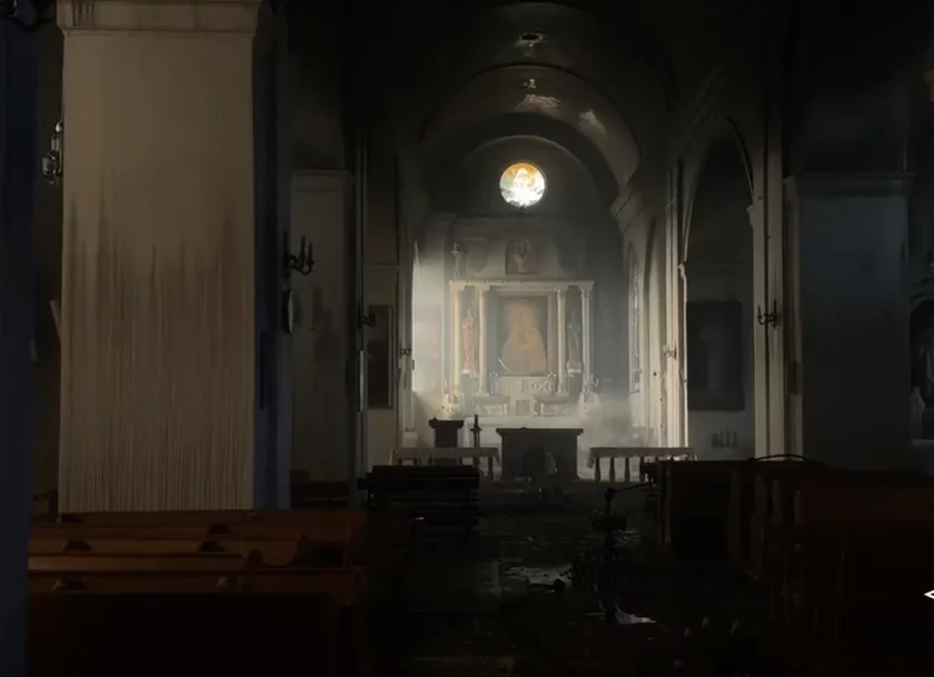Ahniom paškodžany dach i łaty pa ŭsioj płoščy budynka. Zadymleny ścieny, stol i ŭnutranaje ŭbrańnie kaścioła.