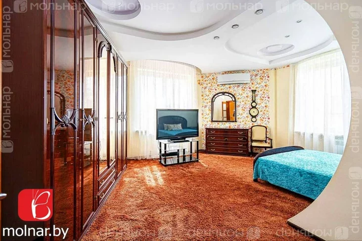 Jość try spalni i pracoŭny kabiniet, try prybiralni i dźvie harderobnyja — adna dla adzieńnia, a druhaja dla abutku. Bonusam idzie i miesca dla parkoŭki.