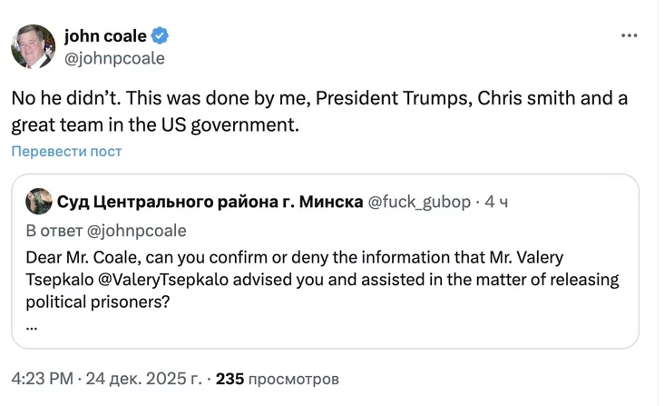 Śpiecyjalny pradstaŭnik prezidenta ZŠA Donald Tramp u sacsietcy X abvierhnuŭ śćviardžeńnie adnaho z udzielnikaŭ prezidenckaj vybarčaj kampanii 2020 hoda, a ciapier daradcy Ałbanskaj inviestycyjnaj karparacyi Valeryja Capkały, što nibyta toj akazvaŭ Koŭłu kansultatyŭnyja pasłuhi ŭ spravie vyzvaleńnia biełaruskich palityčnych źniavolenych.