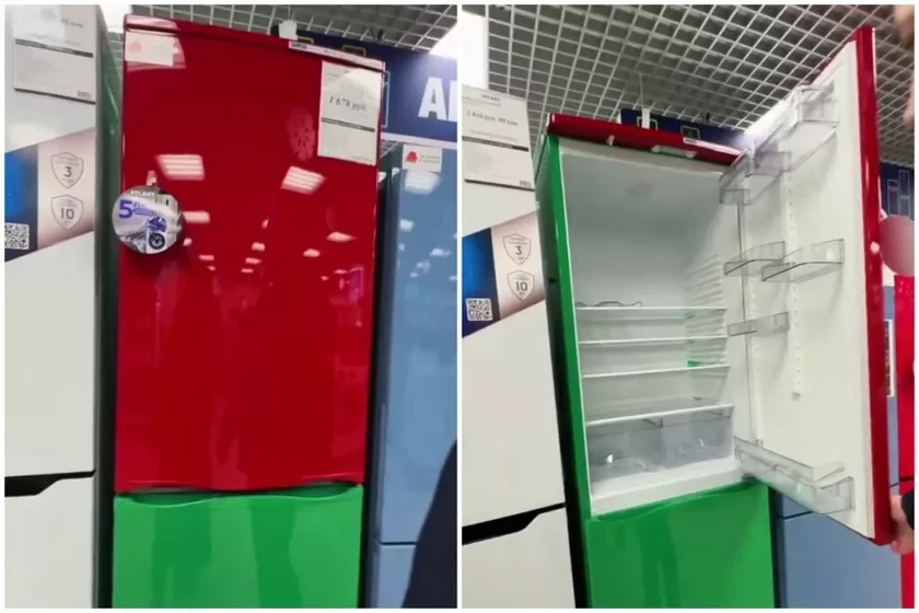 U słuckaj kramie zaŭvažyli čyrvona-zialony chaładzilnik. Cud techniki ŭ kolerach dziaržaŭnaha ściaha zrabili na «Atłancie». Asnoŭnaja častka chaładzilnika vykanana ŭ čyrvonym, a marazilnik — u zialonym.