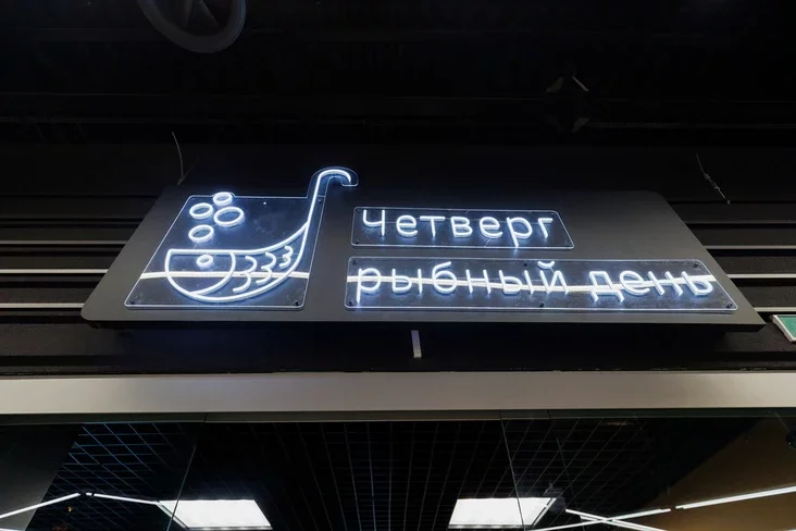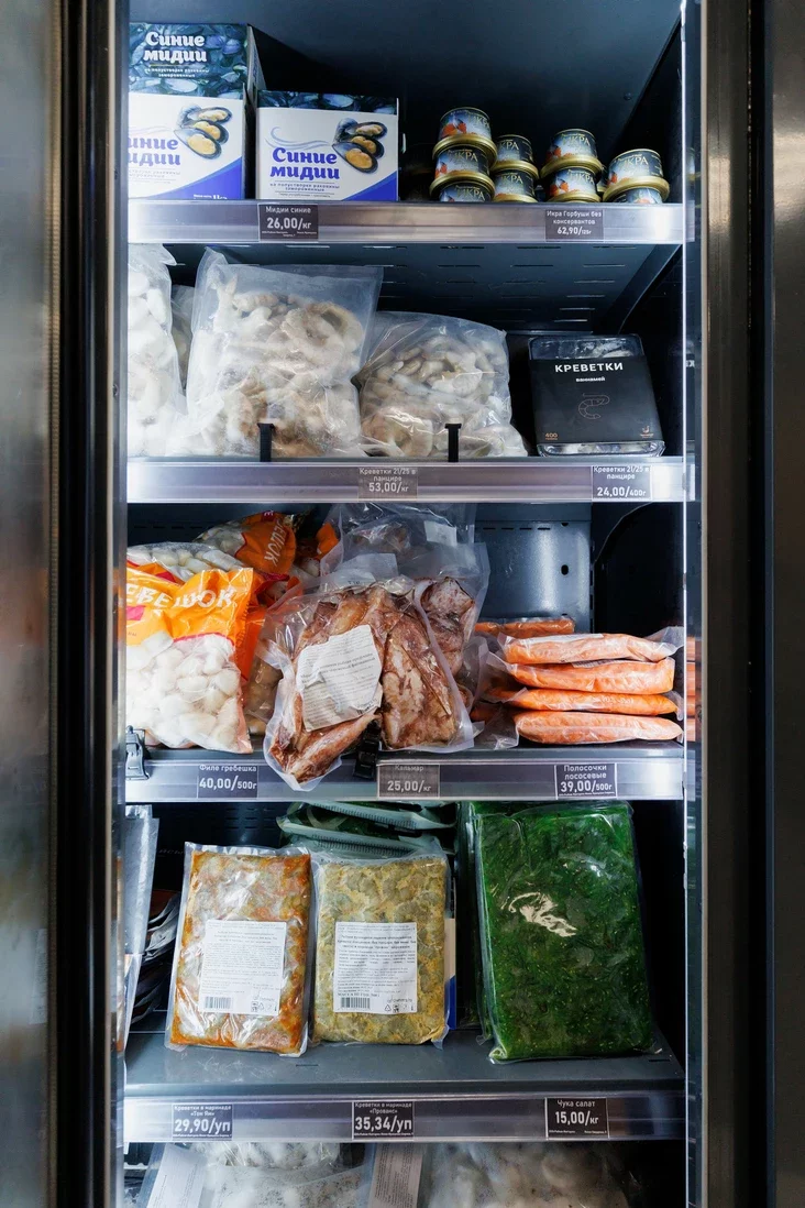 Asobnaja siekcyja vydzielena pad rybnyja paŭfabrykaty: pielmieni, pałački, tefteli z fareli, fišboły i midyi ŭ marynadzie. Siarod supoŭ — tom kcha, tom jam z morapraduktami i boršč ź vielizarnym kavałkam fareli. Ź niezvyčajnaha — file mintaja pad syram.
