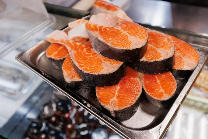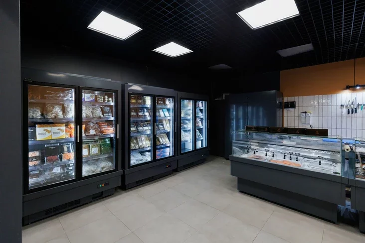 Zboku vystrailisia chaładzilniki z zamarožanaj rybaj i morapraduktami. Tut «vodziacca» vialikija krevietki, kalmary, vaśminohi, hrabieńčyki ŭ rakavinach, sinija i čornyja midyi. Jość taksama słajsy pad karpača, smažany vuhor, miedaljony i stejki z tunca.