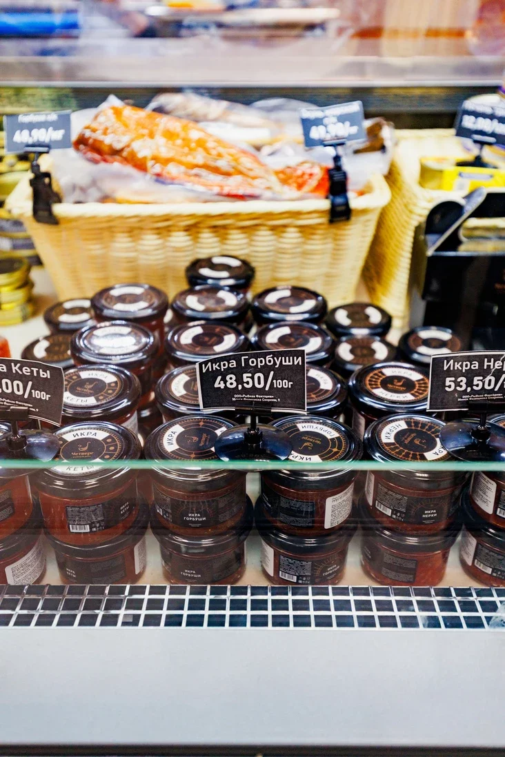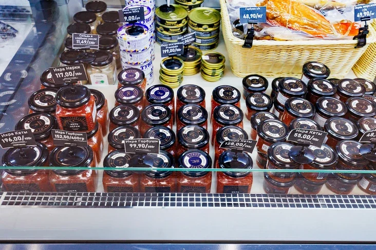 Asnoŭnaja vitryna łomicca ad čyrvonaj i čornaj ikry, u tym liku adbornaj — ad 20‑hadovych asiatroŭ. Pobač vykładziena čyrvonaja ryba — jak salonaja, tak i vendžanaja.