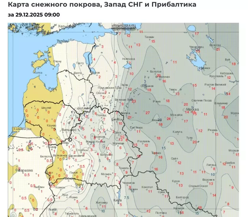 Śniežnaje pokryva na ŭschodzie Biełarusi dasiahnuła vyšyni 15 santymietraŭ. U Minsku — 8 sm.