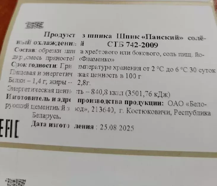 Dziaržstandart uklučyŭ u śpis niebiaśpiečnaj pradukcyi dva vidy špiku — salony «Panski» i vendžany «Pikantny», vyrablenyja filijałam №1 «Cemahra» AAT «Biełaruski cemientny zavod» u Kaściukovičach. Vierahodna, havorka idzie pra ahrarnaje padraździaleńnie hetaha pradpryjemstva.