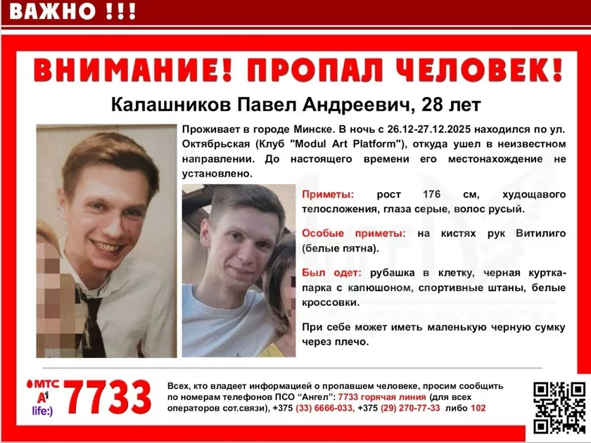 28‑hadovy mužčyna ŭ noč na 27 śniežnia razam z tavaryšam adpačyvaŭ u načnym kłubie Modul Art Platform. Pryjaciel pajšoŭ, Pavieł zastaŭsia adpačyvać, a što było dalej — nichto nie viedaje. Žychara stalicy šukajuć užo piatyja sutki.