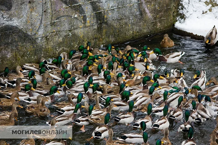 Na kadrach, zroblenych vidavočcami, bačna, što sotni ptušak ščylna raźmiaścilisia na nievialikim učastku vady, jaki jašče nie paśpieŭ zamierznuć. Mahiloŭcy, jakija hulajuć pobač, achvotna padkormlivajuć takuju vialikuju čaradu.