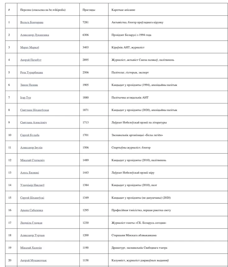 Bondarava i ŭsie astatnija. Top-20 biełarusaŭ, pra jakich u 2025 hodzie čytali ŭ biełaruskaj Vikipiedyi