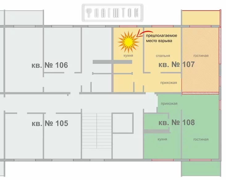 Samaj zakuranaj źjaŭlajecca kuchnia 107‑j kvatery. Pra stan prybiralni i vannaj infarmacyi niama, ale varta dapuścić, što krynica vybuchu mahła znachodzicca i tam.