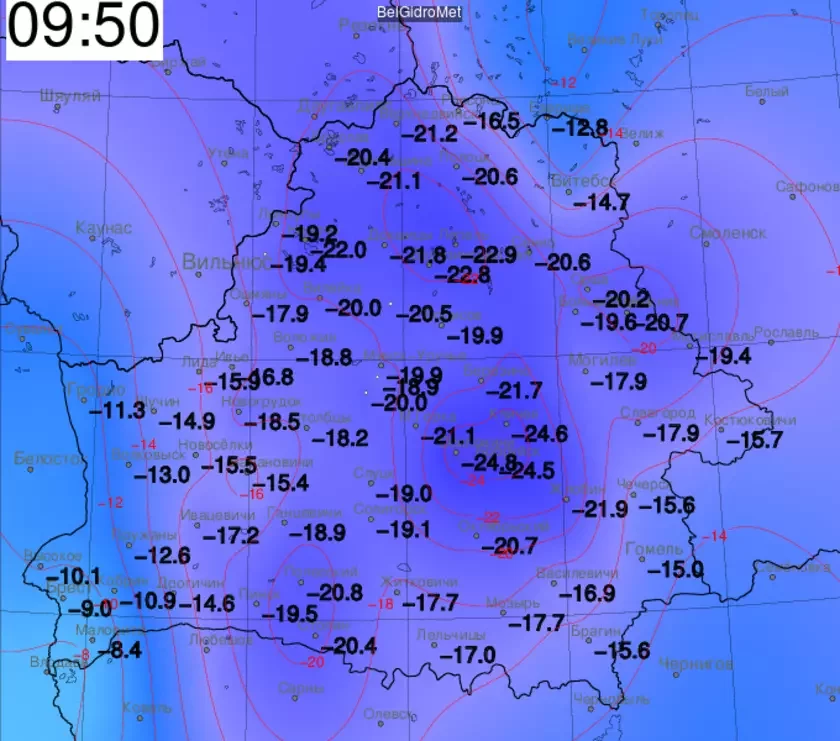 U Babrujsku na 09:50 ranicy minus 24°S. Tamsama byŭ i načny minimum — 26,6°S.