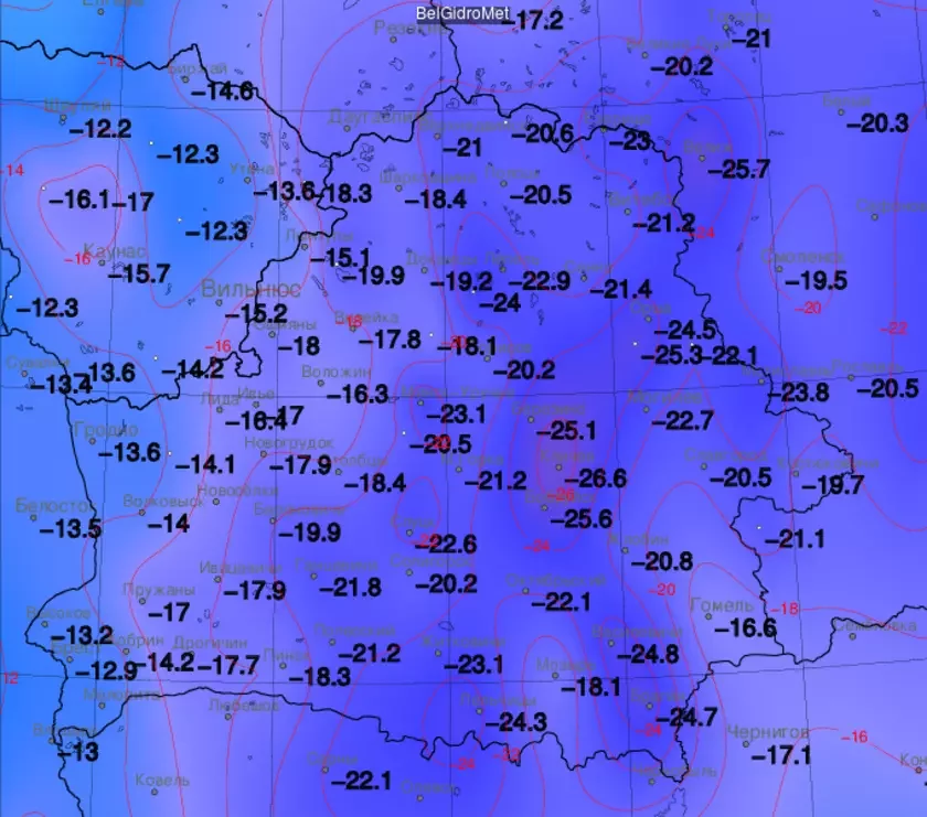 U Minsku było minus 23°S. Najciaplej hetaj nočču było ŭzdoŭž biełaruska-polskaj miažy, usiaho minus 13°S.