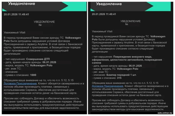 «Fakt paškodžańnia byŭ vyznačany na padstavie łancužka arend (Vitala i papiaredniaha klijenta) i fotafiksacyi. Da pačatku arendy Vitala papiarednim klijentam aŭtamabil byŭ zafiksavany biez paškodžańniaŭ. Vital pačaŭ arendu biez fotafiksacyi stanu aŭtamabila, adnak pry zaviaršeńni arendy samastojna zrabiŭ fatahrafii, na jakich bačnaja raskolina na bampiery, — raspaviali žurnalistu Onlíner u kampanii Anytime.