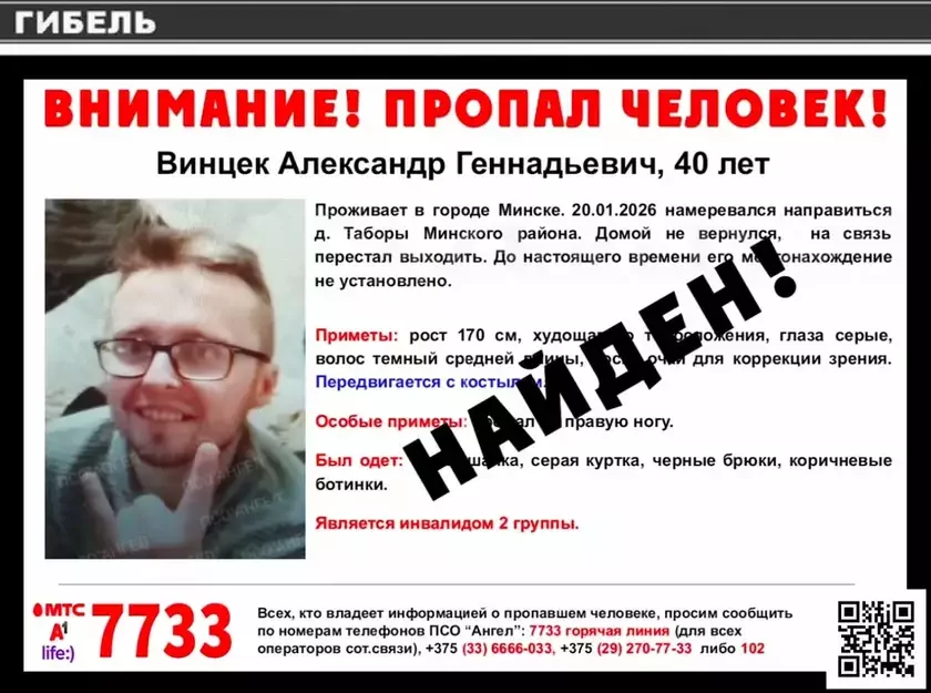 Pošukavy atrad «Anioł» paviedamiŭ, što znojdzieny niežyvym 40‑hadovy Alaksandr Vincek, pošuki jakoha vialisia paśla taho, jaje mužčyna źnik 20 studzienia.
