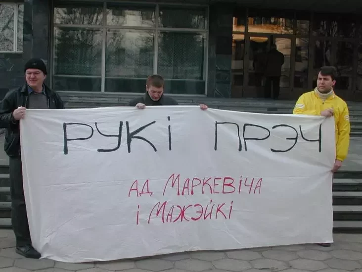 ŁR: Z baćkami ja naviedvała roznyja mitynhi ŭ Harodni, Dni Voli tyja ž, u bolš darosłym uzroście nasiła na ruce bieł-čyrvona-biełuju stužku. Darečy, pra toje, što majho tatu zatrymlivali paśla adnoj z akcyj, ja daviedałasia tolki ŭ darosłym uzroście. Tady zatrymali Paŭła Mažejku, ź jakim jany razam pracavali ŭ «Pahoni», i tata z Andžejem Pačobutam, Andrejem Mialeškam (na fota nižej. — NN) i ź inšymi kalehami vychodzili na niekalki pikietaŭ.