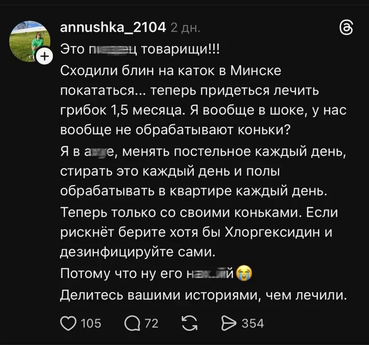 U sacyjalnaj sietcy Threads nabrała papularnaść historyja dziaŭčyny, jakaja, naviedaŭšy katok, zaraziłasia hrybkom praz prakatnyja kańki. Jana vykazała abureńnie jakaściu sanitarnaj apracoŭki invientara i adznačyła, što ciapier joj daviadziecca prajści praciahłaje lačeńnie. Paśla hetaha vypadku dziaŭčyna vyrašyła ŭ dalejšym chadzić na lod tolki sa svajoj ułasnaj ekipiroŭkaj, piša «Minskaja praŭda».