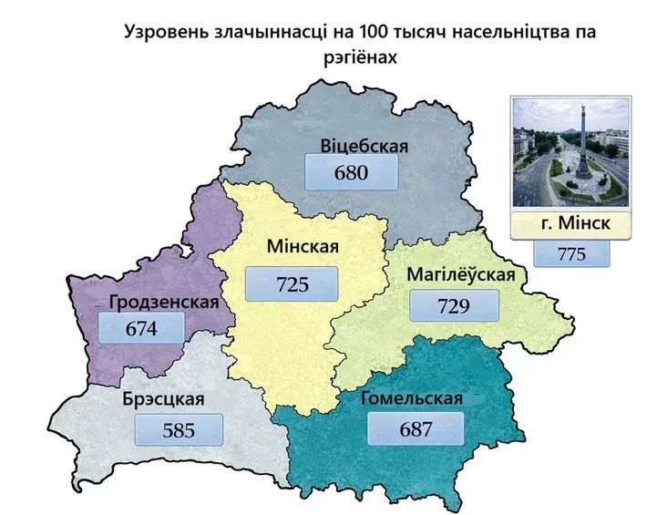 Siarod rehijonaŭ najmienšy ŭzrovień złačynnaści na 100 tysiač čałaviek nazirajecca ŭ Bresckaj vobłaści — 585 vypadkaŭ. A voś u stalicy hety pakazčyk byŭ samym vysokim — 775 vypadkaŭ.