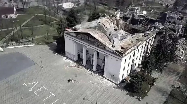 16 sakavika 2022 hoda rasijskija VKS skinuli na teatr dźvie 500‑kiłahramovyja bomby, viedajučy, što ŭnutry znachodzicca samaje vialikaje ŭ horadzie schovišča. Pierad fasadami teatra vielizarnymi litarami byŭ naniesieny nadpis «DIETI», jaki bačyli spadarožniki, ale «nie zaŭvažyli» rasijskija piłoty. Pavodle rasśledavańnia Associated Press, pad plitami teatra zahinuli kala 600 čałaviek.