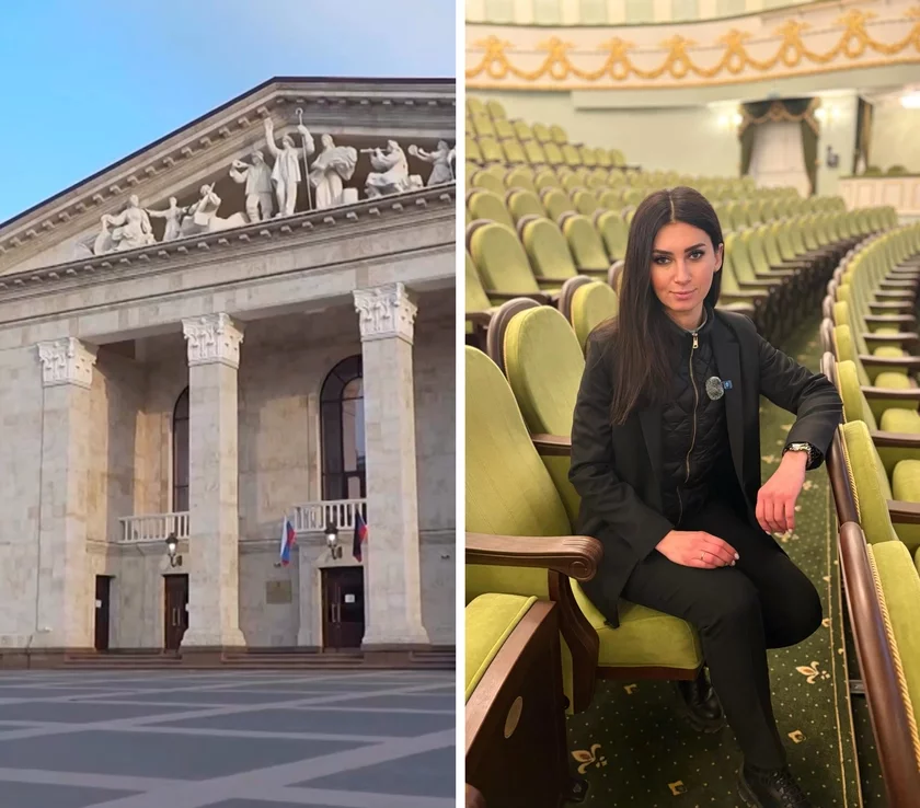 Ksienija Lebiedzieva stała adnoj ź pieršych zamiežnic, kaho akupacyjnyja ŭłady dapuścili ŭnutr adbudavanaha budynka Maryupalskaha dramteatra. U svaim videa jana z zachapleńniem pakazvaje śviežuju pazałotu i novuju lustru, całkam ihnarujučy toj fakt, što novy teatr uźviedzieny, kab prychavać masavaje zabojstva.