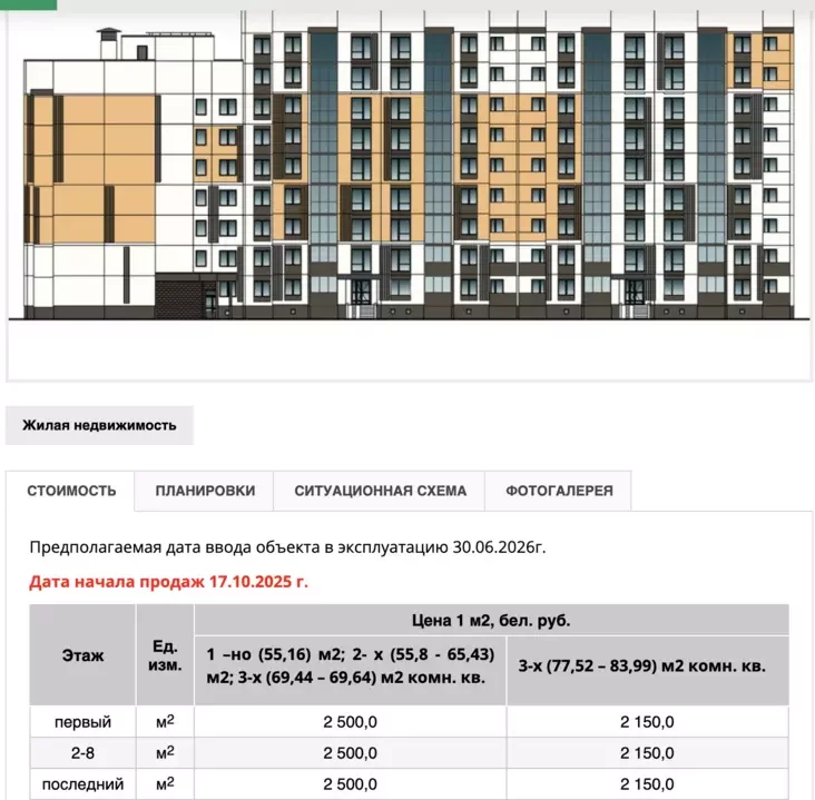 Ceny na kvatery ŭ šerahovaj 9‑paviarchovaj panelcy na ŭskrainie Hrodna. Fota: skrynšot z sajta ghb.by