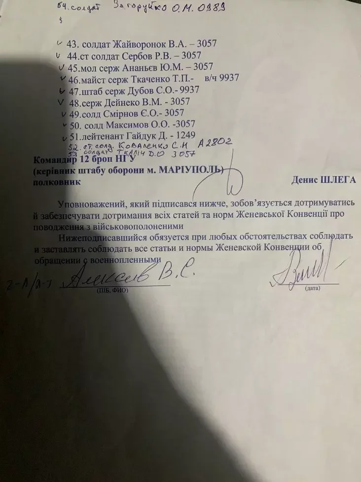 Hienierał abiacaŭ azoŭcam vykanańnie rasijanami Ženieŭskaj kanviencyi ab abychodžańni z vajennapałonnymi i harantavaŭ narmalnyja ŭmovy ŭtrymańnia dla ŭkrainskich pałonnych. I mienavita jaho podpis stajaŭ pad adpaviednym dakumientam, padpisanym tady ŭ Maryupali.