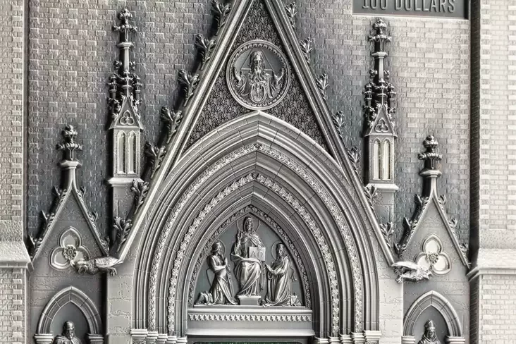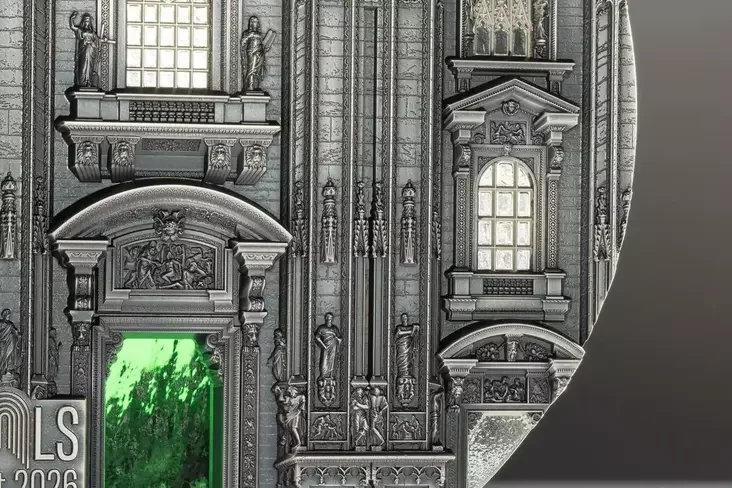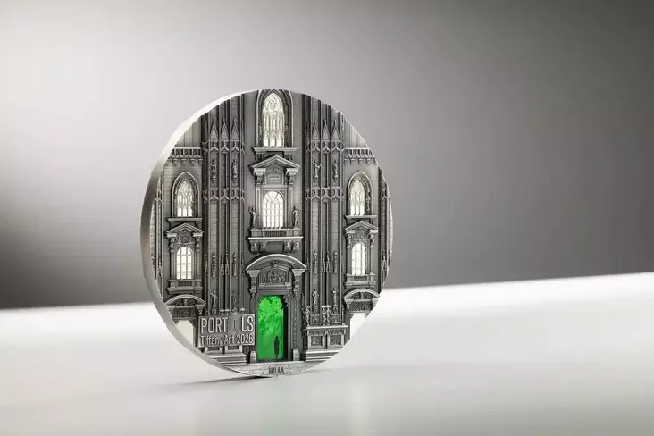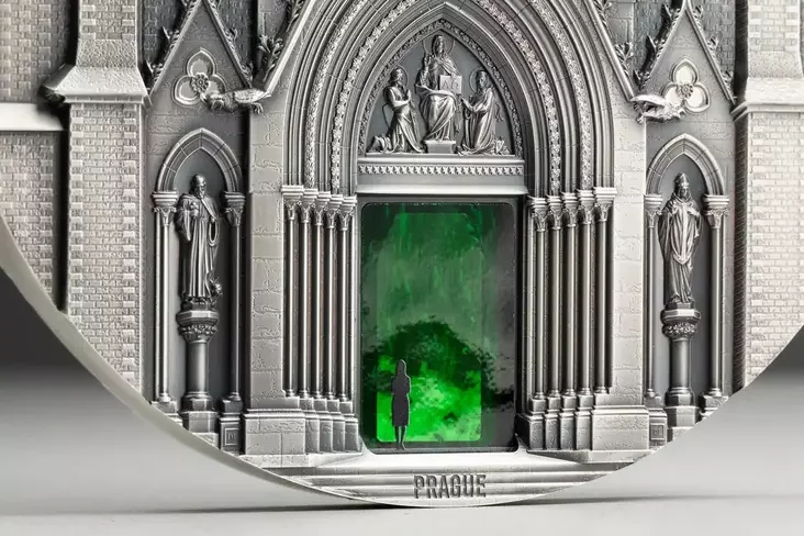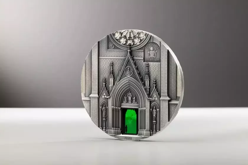 Na adnym baku maniety źmieščana vyjava hałoŭnaha fasada Miłanskaha sabora, a na druhim — uvachod u chram śviatoj Ludmiły ŭ Prazie.