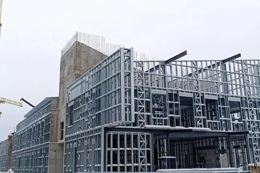 Z kanstrukcyj ŁSTK (lohkija stalnyja tonkaściennyja kanstrukcyi) i manalitnych ustavak užo vyrazna vymaloŭvajecca hałoŭny korpus. Pracujuć dva viežavyja krany i śpiecyjalnaja technika.