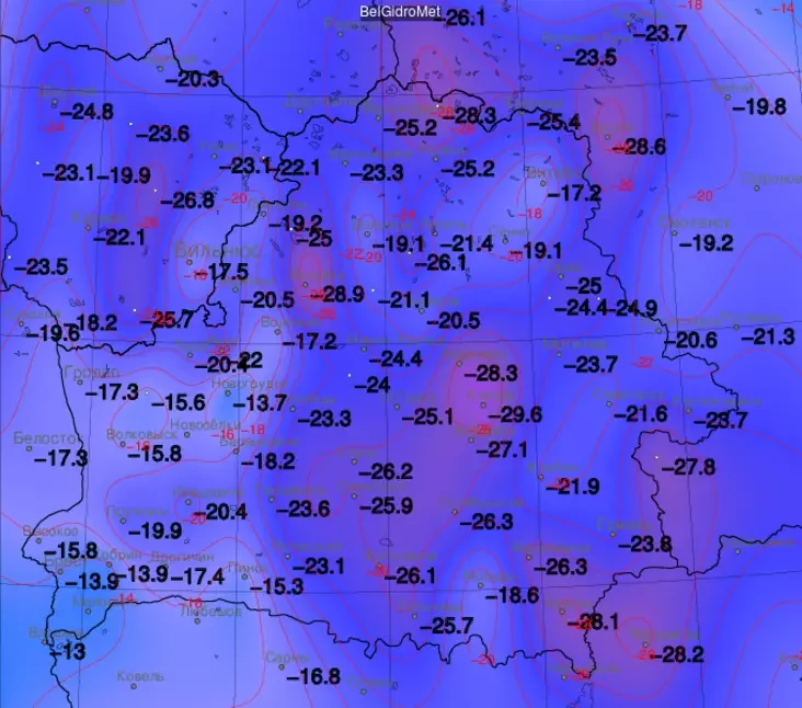 U Kličavie było minus 29,6°S, u Vilejcy — -28,9°S, u Brahinie — -28,1°S.