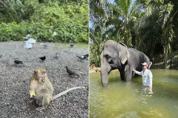 «Vybirajučy ekskursii, spynilisia na topavych napramkach, jakija, na moj pohlad, abaviazkovyja dla naviedvańnia — zapaviednik słanoŭ i vostraŭ małpaŭ. Zapłacili 2000 bat (200 rubloŭ) z čałavieka. Słany — heta poŭnaje zachapleńnie! U zapaviedniku ź imi možna nie tolki sfatahrafavacca, ale i pakarmić ich, pakupacca razam i navat prakacicca viercham. A voś z małpami raju trymać vucha vostra. Jany istoty ahresiŭnyja: kali im štości nie spadabajecca, mohuć i ŭkusić. U mianie prosta z ruk vyrvali pakiet z sadavinoj, jakuju my im i vieźli.