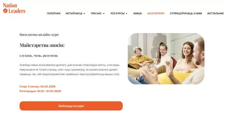 16 lutaha pačaŭsia zapis na biaspłatny anłajn-kurs «Majsterstva znosin» ad «Nacyi lidaraŭ». Na kursie vy zasvoicie navyk asensavanaha dyjałohu, dzie kožnaje słova buduje masty, a nie mury. Navučyciesia nie tolki słuchać, ale i čuć surazmoŭcu za šumam ułasnych dumak i havaryć tak, kab ludzi razumieli vas pravilna i prysłuchoŭvalisia da vašych słoŭ.