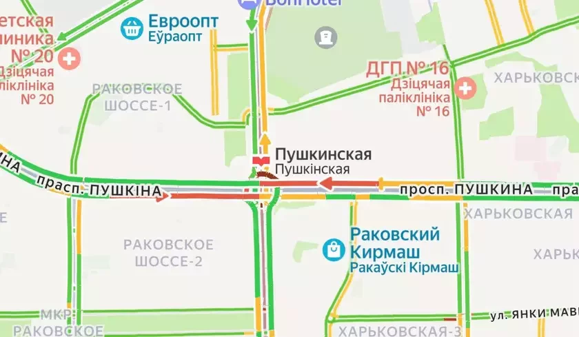 Praz abryvańnie kantaktnych sietak abciažarany ruch na skryžavańni praśpiekta Puškina i vulicy Prytyckaha, paviedamlaje ahienctva «Minsk-Naviny».