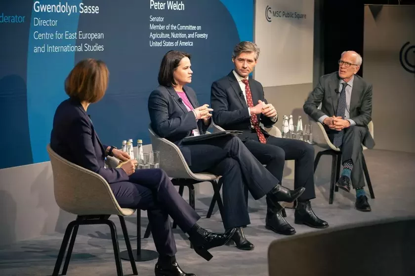 U dyskusii asnoŭnaj prahramy Miunchienskaj kanfierencyi ab biaśpiecy «Biełaruś — u centry ŭvahi» pryniali ŭdzieł lidarka biełaruskich demsił Śviatłana Cichanoŭskaja, ministr zamiežnych spraŭ Litvy Kiastucis Budrys i amierykanski sienatar Piter Uełč. Maderavała sustreču dyrektarka Centra ŭschodniejeŭrapiejskich i mižnarodnych daśledavańniaŭ Hviendalin Zase.