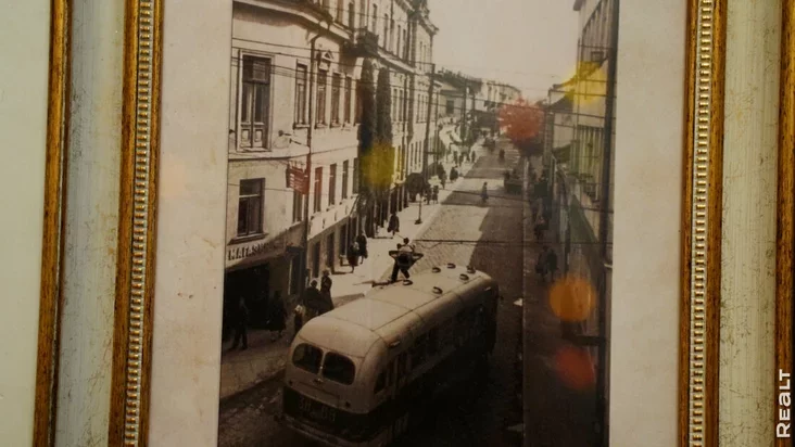 Mužčyna zachaplajecca historyjaj, tamu ścieny i palicy ŭpryhožany fatahrafijami Hrodna ŭ roznyja pieryjady. Na zdymkach možna razhladzieć Faru Vitaŭta, jakuju ŭ 1961 hodzie ŭzarvali pa rasparadžeńni ŭład. Da hetaha hatyčny kaścioł praisnavaŭ amal 570 hadoŭ. Tut ža vidy na Stary zamak da rekanstrukcyi i źjaŭleńnia dramteatra.