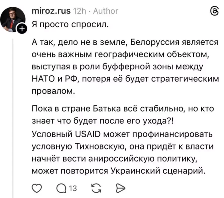 Rasijanin ź nikam miroz.rus, padpisany jak Michaił Hłuchaŭ, u Threads źviarnuŭsia da biełarusaŭ z pytańniem: «Kali zaŭtra ŭ krainie budzie refierendum ab uvachodžańni ŭ skład Rasii, ci pahadzilisia b vy?» Adkaz pryjšoŭ chutka: jamu nakidali bolš za 1400 kamientaroŭ.