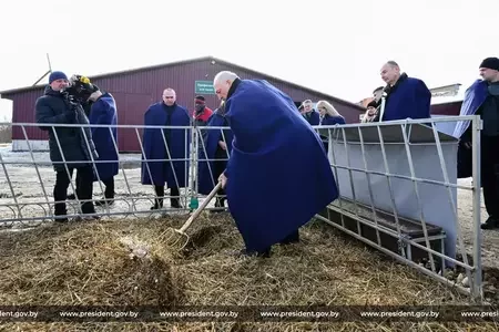 Uziaŭšy viłki i padniaŭšy płast sałomy, Łukašenka pad joj znajšoŭ nieprybrany śnieh i lod, što stała nahodaj dla pračytańnia natacyi padnačalenym.