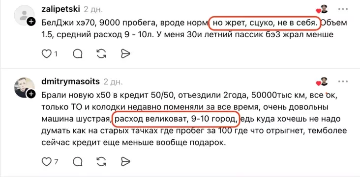 «Nabyli X50 paŭtara hoda tamu, prabieh 20 tysiač, vielmi zadavolenyja i ciapier znoŭ by kupili. Uzimku raschod 12 litraŭ, letam 9—10. Sprytnaja, vysokaja, usio padabajecca. Servis spraŭlajecca dobra».