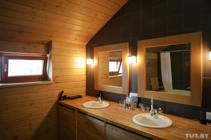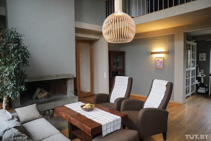Sercam doma źjaŭlajecca dvuchśvietłavaja haścioŭnia sa stollu vyšynioj 7,4 mietra i panaramnymi vitražnymi voknami. Kamin u haścioŭni taksama niestandartny: ačah šyrynioj 1,4 mietra adlity ź bietonu «ŭručnuju».