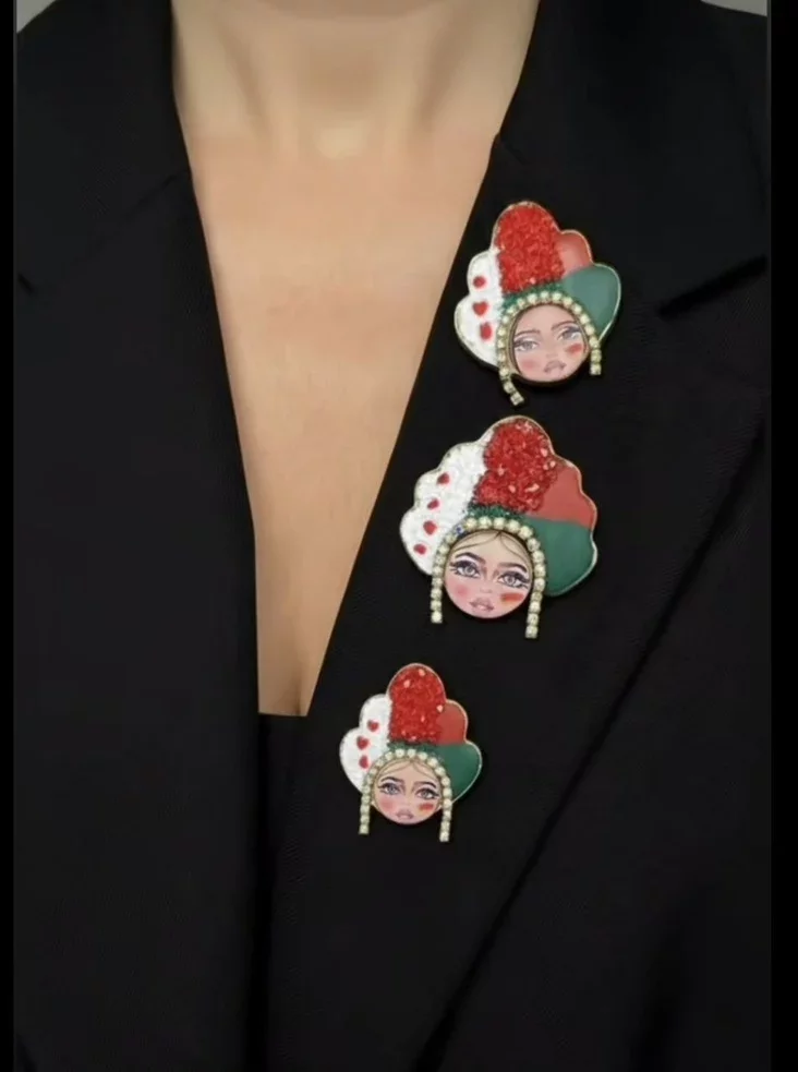 Niečakana vyrabam, jaki najbolš aktyŭna abmiarkoŭvali karystalniki sacsietak, stali broški dy padviesy ŭ vyhladzie dziaŭčat ź zialona-čyrvonymi kakošnikami.