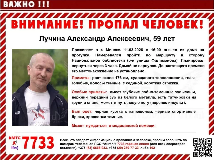 Pošukava-vyratavalny atrad «Anioł» paviedamiŭ pra źniknieńnie 11 sakavika 59‑hadovaha Alaksandra Łučyny.