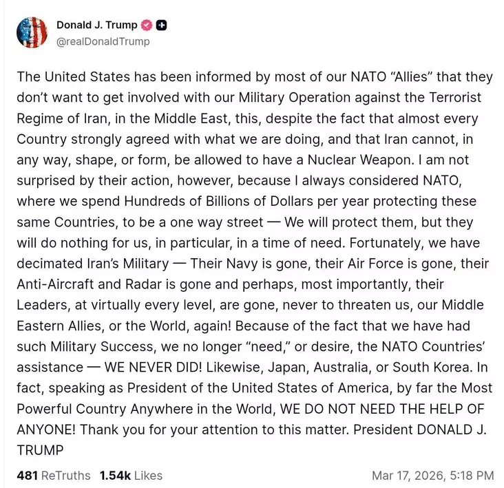 Prezident ZŠA Donald Tramp napisaŭ u svajoj sacsietcy Truth Social, što «bolšaść sajuźnikaŭ» pa NATA paviedamili Vašynhtonu, što nie chočuć umiešvacca ŭ vajennuju apieracyju ZŠA i Izraila suprać Irana. Heta vyklikała ŭ jaho mocny hnieŭ.